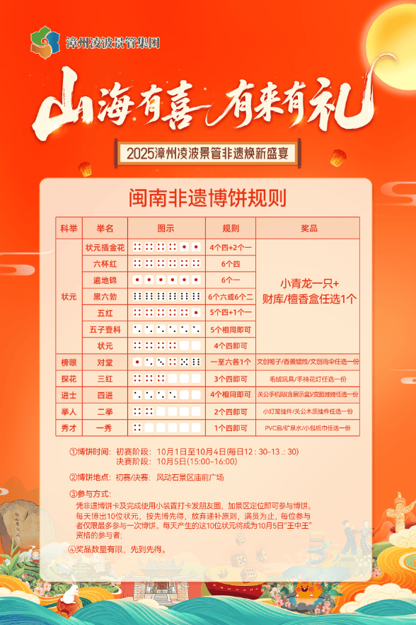 参与规则:凭券及装置打卡发朋友圈并加景区定位,额外加送1次博饼机会(每日限量500张券)。