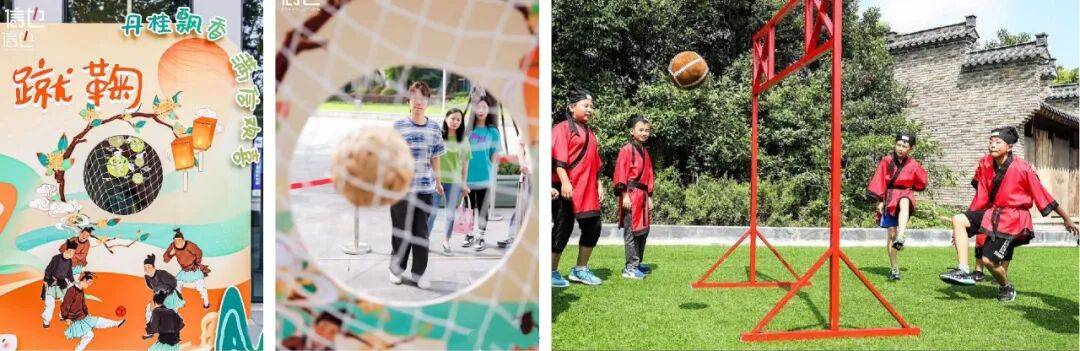 蹴鞠是古代的足球项目。活动现场设置蹴鞠区域,来宾凭探秘地图可打卡此项目,每人3次机会,在规定线外成功踢入球门,即为打卡成功。